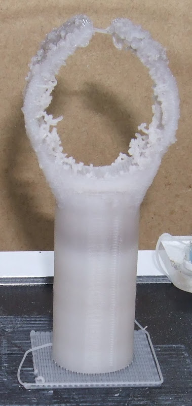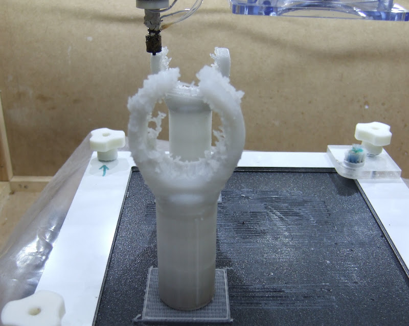 When building the curved arms Enrique's software switches to 100% fill because it decides part of the layer is two layers from an outer horizontal surface, which a thin sliver down each side is. That would not be a problem in itself but because I have the infill overlap option set it ends up with slightly too much plastic on the 100% layers. As the height increases this excess builds up until the nozzle is actually submerged in the object while it is building it. Amazing that it manages to make anything resembling the correct shape!