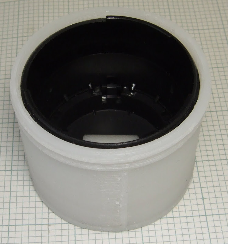 The outside diameter of the adapter is about 48.5mm so I made the pot I.D. 50mm to allow some clearance. It actually shrank to 48.5mm, so it is a snug fit. Lucky it didn't shrink any more!