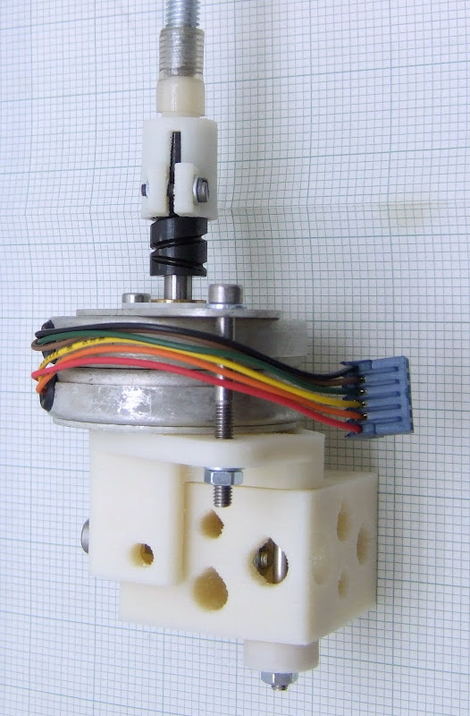 The boss on the back of the motor is a bit bigger than the motors I used before so I have updated the bracket design accordingly. The motors come with a spiral drive screw on the shaft. I could not find a way of getting it off, so I made a new coupling piece that clamps over it. It has a pointer so that it is visually obvious if the motors get out of step with each other.