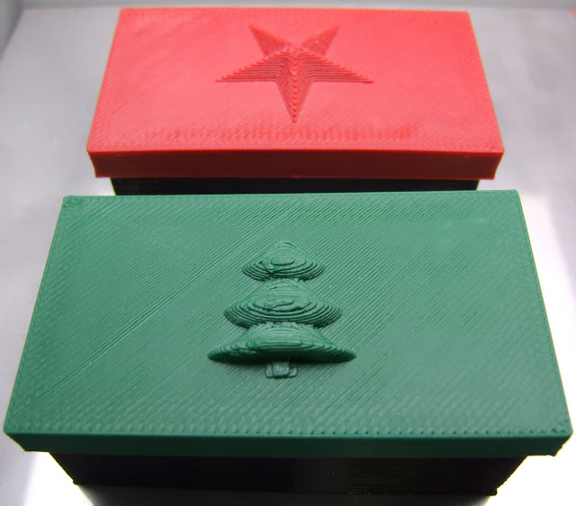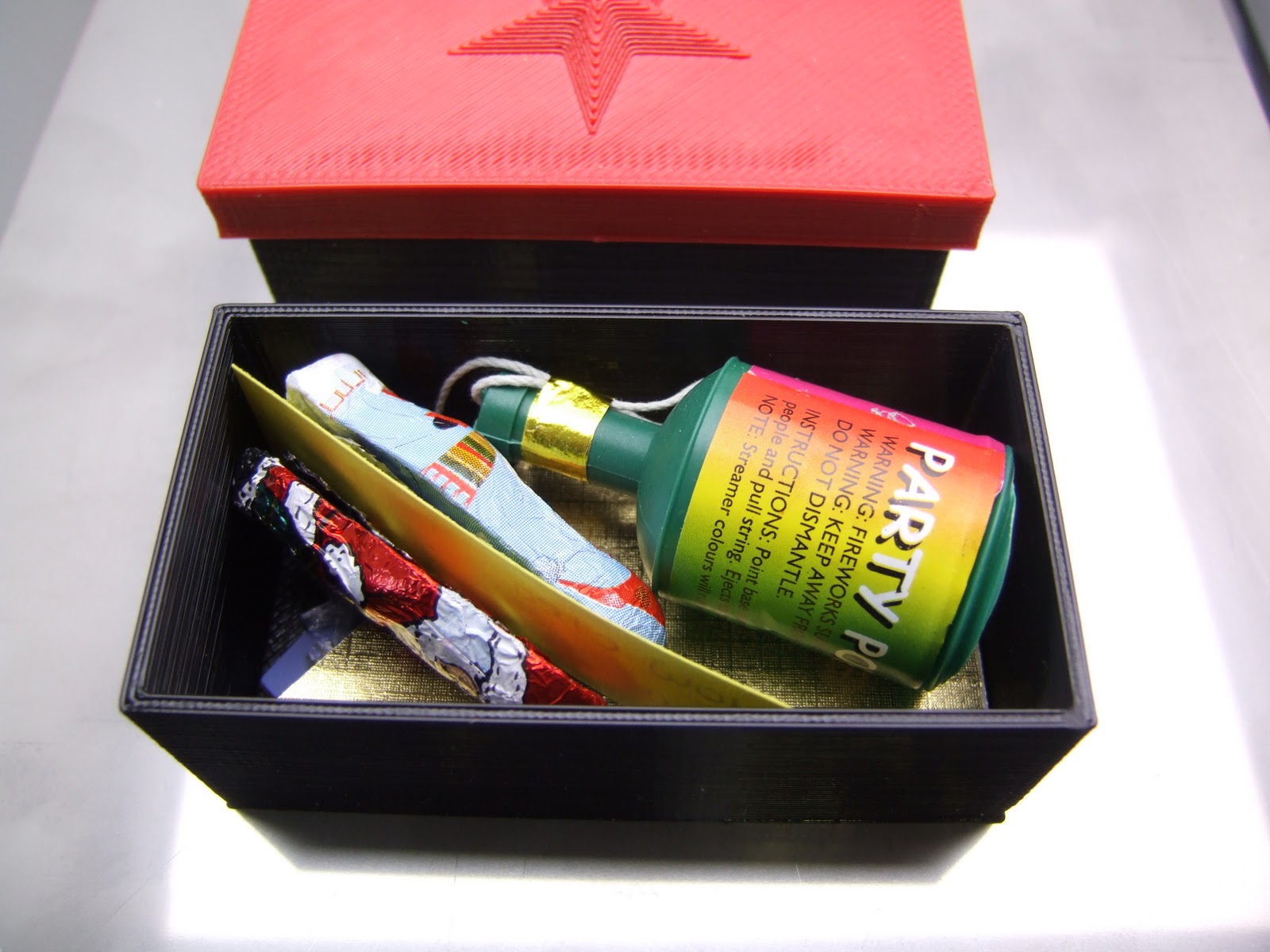 This year she asked me to make some reprapped boxes instead to contain the usual cracker contents and look decorative on the table. The explosive element to be provided by a party popper. This is what I came up with: -