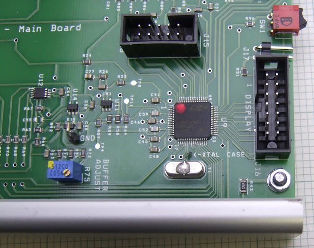 I trimmed the long wires from the LCD display to reduce the clearance needed from the back of the PCB to 1.5mm. I also bent the test pins on the main board to reduce their height. I replaced the plain washers and nylocs shown earlier with shake proof washers and plain nuts. The washers dig into the aluminium to hopefully make a good connection through the oxide.